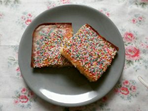 Nun kann man, wenn der Kuchen abgekühlt ist, Zuckerguss drüber geben und dann beliebig dekorieren 🙂