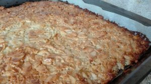 Nach ca 10-15 min wenn der Teig oben leicht angetrocknet ist, nicht mehr weich ist aber noch nicht angefangen hat zu braten, die Mandelbutterschicht drüber verteilen und nochmal bei Umluft 180-200° C backen, bis es schön knusprig ist.