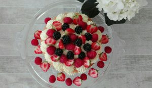 Dieser Naked-Cake besteht aus einem weichen Boden und einer Ganache aus weißer Schokolade. Dekoriert habe ich ihn mit Himbeeren, Erdbeeren und Brombeeren 🙂Den Kuchenboden habe ich nach diesem Rezept zubereitet und in einer 21cm breiten runden Kuchenform gebacken.