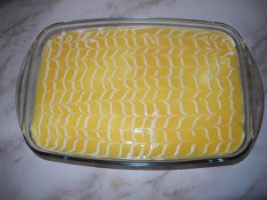 Nun die Orangencreme über die Sahneschicht gießen und schön glatt streichen. Zu aller letzt, habe ich mit dem Spritzbeutel gefüllt mit Sahne, gerade Striche über dem Kuchen verteilt und dann mit einem Holzstäbchen durchgezogen, sodass ein sehr schönes Muster entsteht.