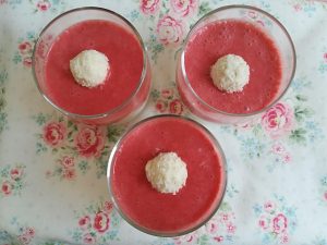 Jetzt geht es ans Dekorieren. Bei meinen Gläsern habe ich eine Cremeschicht und dann eine Erdbeerschicht übereinander geschichtet. Vor dem Servieren kann man dann noch in jedes Glas in die Mitte ein Raffaello legen und schon ist das Dessert geschafft.